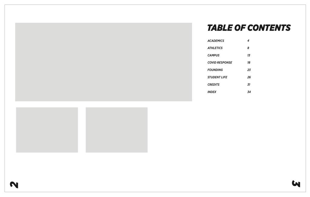 The second image in the slideshow is the layout design of the table of contents. As mentioned before, these designs are simple layout-based. A skeleton-type design should not be the ultimate test for deciding how a page might look. However, by viewing this page in particular, one can get a sense of where images might be placed, the use of white space, and gather how typography might be utilized on the spread.