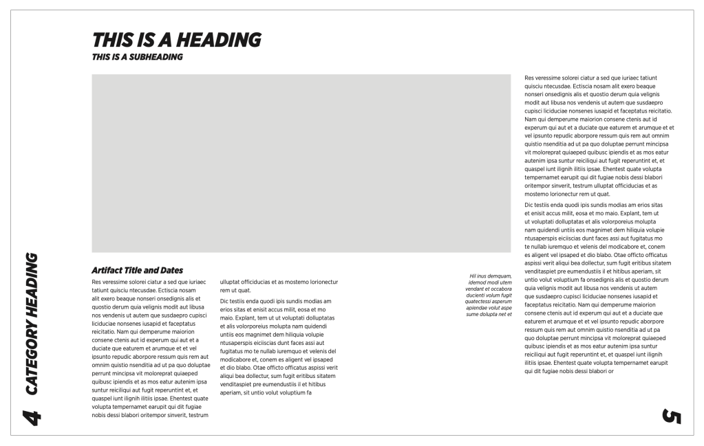 The next three pages are examples of how my catalog might show the artifacts that are being presented in the exhibition. These three pages are simply just different layout designs that may be used to show the artifacts of the six categories that we are showcasing in the exhibition. These layout mockups show image placement, heading design, pages number decisions, body copy composition, and of course white space utilization.