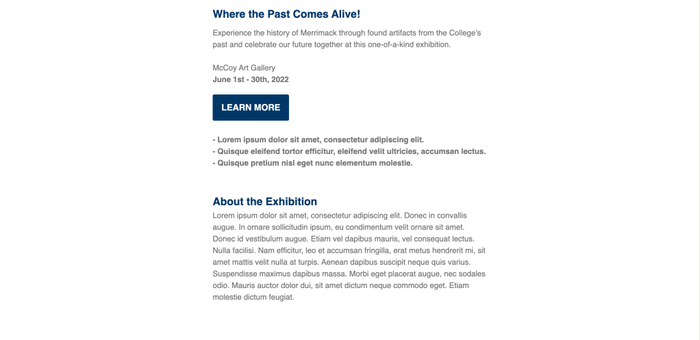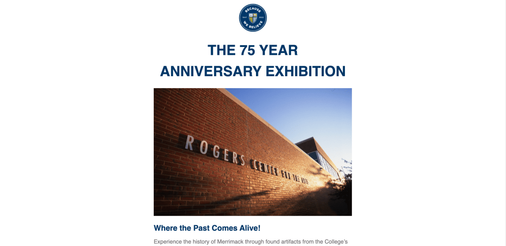 While creating all of this work for the 75-year exhibition is great, how will one become aware of the show itself. Of course, word of mouth and coming across the exhibition will turn heads. But, how will all of our hard work become knowledge to the masses? Earlier in the year, a fellow Merrimack College professor completed a presentation regarding email design and the tremendous benefits that can be reached when an email is well-designed.